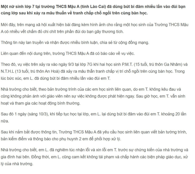 Lào Cai:Tran.h ch.ấp chỗ ngồi, nũ sinh lớp 7 dùng bút bi đ.âm nhiều lần vào đ.ùi bạn học.
